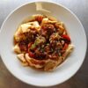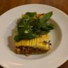 Queso, pistou (pesto de tomates) vegetales asados, rúcula .