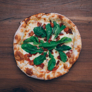 Muzzarella, salsa, rucula y jamón crudo